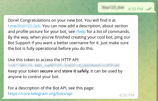 And if the user name is not taken, BotFather will congratulate you and send you the token to access the HTTP API. To build the bot you need the token. And the token can be used by anyone to control your bot. Therefore, your should keep your token secure and store it safely. Now copy the access token.